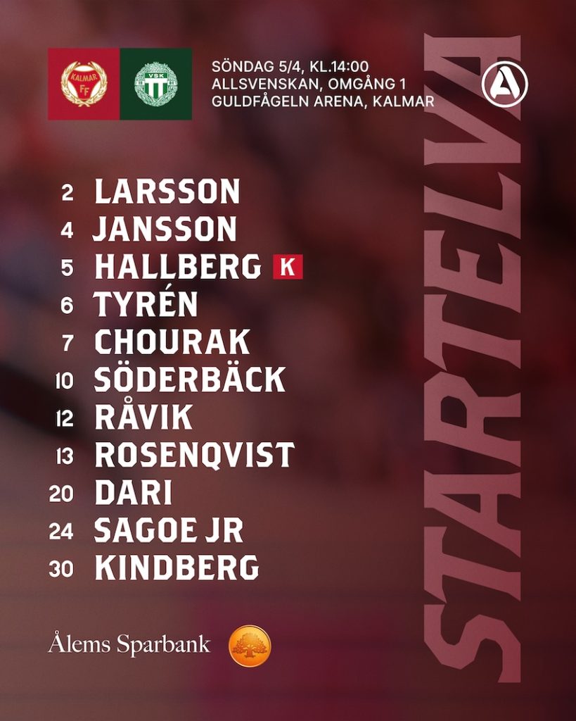 Med en timme kvar till avspark har Kalmar FF:s huvudtränare Toni Koskela presenterat startelvan till dagens allsvenska premiär på Guldfågeln Arena.