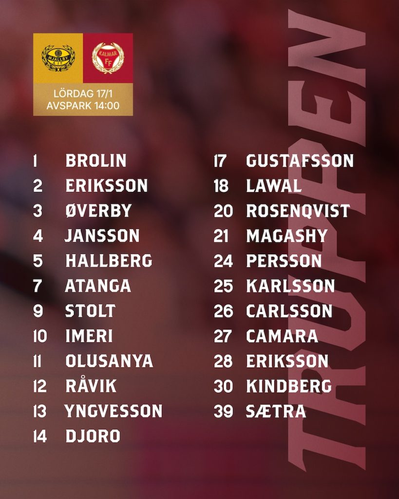 I eftermiddag kl.14:00 är det dags för årets första träningsmatch där Kalmar FF ställs mot Mjällby AIF på Strandvallens konstgräs. Har du inte möjlighet att vara på plats sänds matchen live på Aftonbladet plus med start kl.13:50.