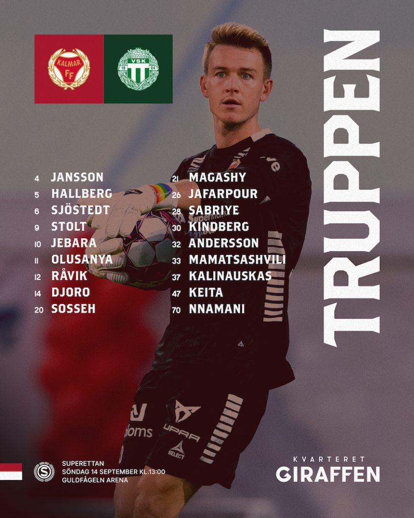 Kl.13:00 är det avspark på Guldfågeln Arena för dagens hemmamatch där Kalmar FF tar emot Västerås SK. Kalmar FF:s huvudtränare Toni Koskela har tagit ut en 18-mannatrupp som presenteras här nedanför.